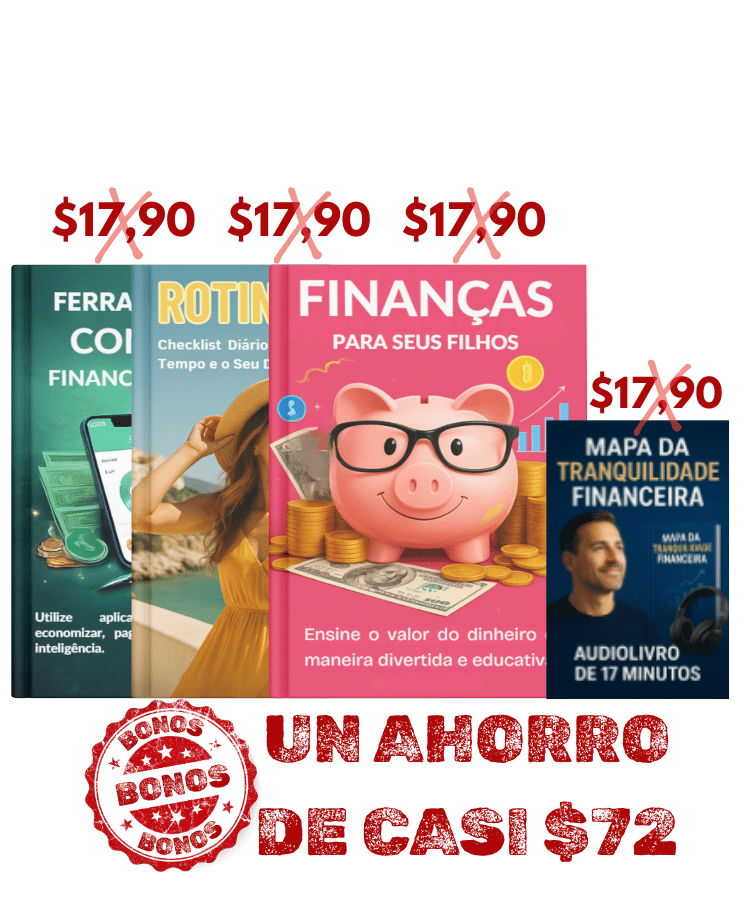 Al adquirir EL MAPA DE LA TRANQUILIDAD FINANCIERA hoy, recibirás TOTALMENTE GRATIS estos 4 regalos exclusivos que te ayudarán a construir una vida más organizada, consciente y en calma económica: